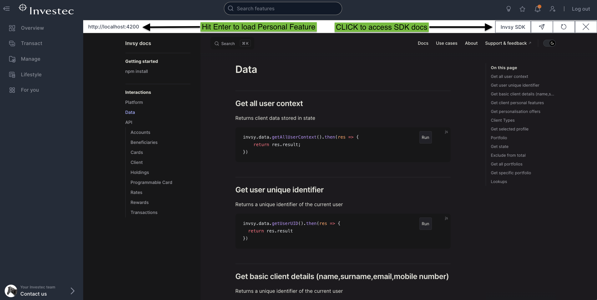 }For a full list of all the capabilities and APIs in the SDK, you can open the live documentation inside Investec Online in within the development mode address bar by clicking the Invsy SDK button: